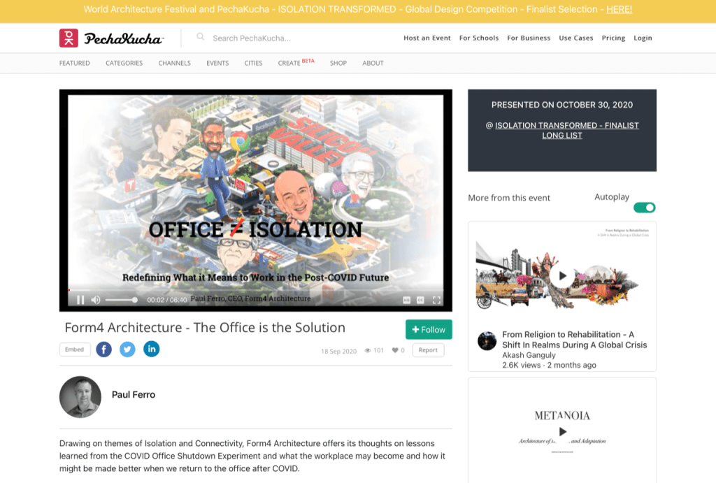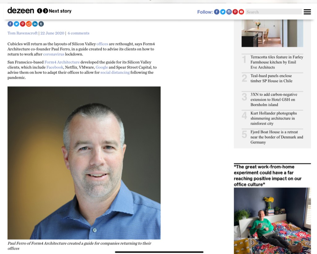 This year there has been a great deal of press interest in design solutions that address health concerns raised by COVID-19. Form4 Architecture worked on a design guide for workplaces that explores how our clients in and around the Silicon Valley can future-proof their offices from the effects of pandemics.