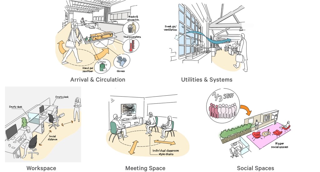 The world’s leading on-line architecture magazine Dezeen took interest in our approach. They published an article describing how many of the recent spatial practices for making the workplace increasingly social were at odds with new measures required to maintain safe distances between staff.